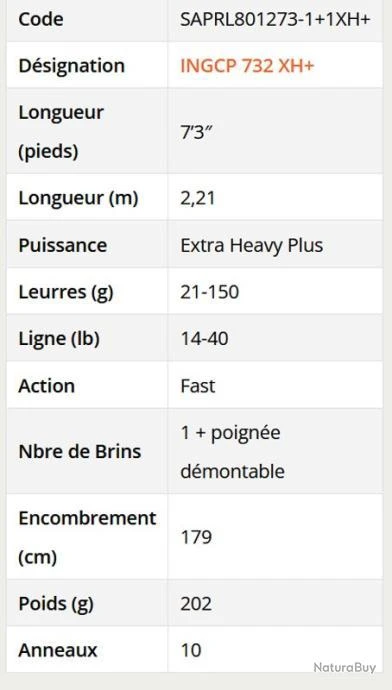 Caractéristiques de la canne casting Ionizer G2 2.21 M 21-150 G INGCP 732 XH+ Power Game Serie