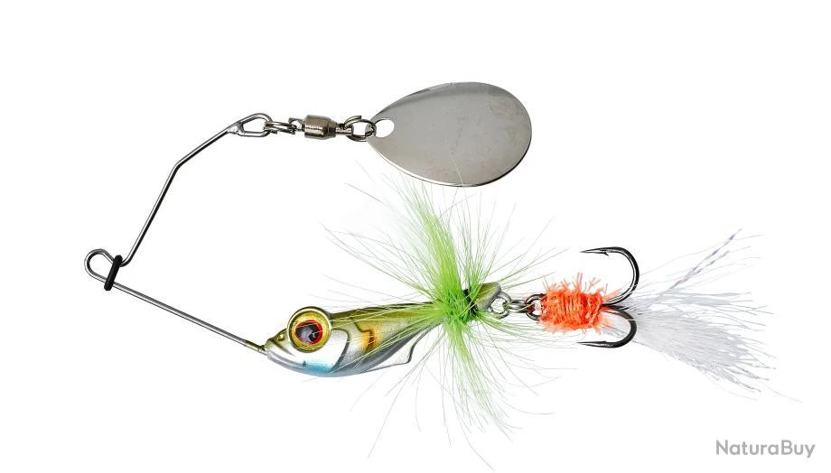 l’ALVIN FLY est un mini spinnerbait compact dont le design suggère la forme d’un petit poisson. Il se lance avec une extrême précision et vous permettra une prospection minutieuse de vos postes. Il travaille aussi bien à la descente qu’en récupération continue, même à faible vitesse. Stable et parfaitement équilibré, sa palette ‘colorado’ offre un maximum de vibrations sans pour autant trop ‘tirer’ dans la canne.l’ALVIN FLY est un mini spinnerbait compact dont le design suggère la forme d’un petit poisson. Il se lance avec une extrême précision et vous permettra une prospection minutieuse de vos postes. Il travaille aussi bien à la descente qu’en récupération continue, même à faible vitesse. Stable et parfaitement équilibré, sa palette ‘colorado’ offre un maximum de vibrations sans pour autant trop ‘tirer’ dans la canne. Proposé avec une jupe ‘mouche’ en plume, son hameçon (articulé) est surmonté d’un teaser réalisé en tincels & fibres synthétiques. Le premier avantage de ce teaser est de concentrer les attaques d’un carnassier précisément sur le ‘piège’ grâce au signal cible qu’apporte le point coloré. Mais surtout la mobilité dans l’eau de l’hameçon est améliorée. Il sera plus facilement aspiré à la moindre tentative d’un carnassier, même hésitante. L’ALVIN à le volume et le profil idéal des proies préférées des carnassiers en été. Des truites dans les gros courants aux carnassiers autour des herbiers, rien ne lui échappe! Lest en Bismuth-Tin. Hameçon #8.