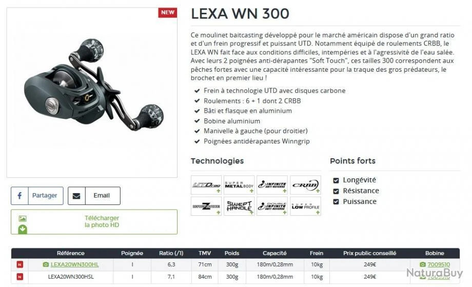 Caractéristiques du moulinet baitcasting Daiwa Lexa 2020 WN 300 HL: